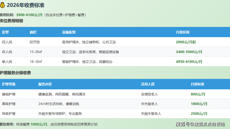 上海秋晖养老院采用"床位费+护理费+餐费+综合管理费"的透明收费模式,所有项目清晰公示,无任何隐形消费。以下是2026年的详细收费构成: