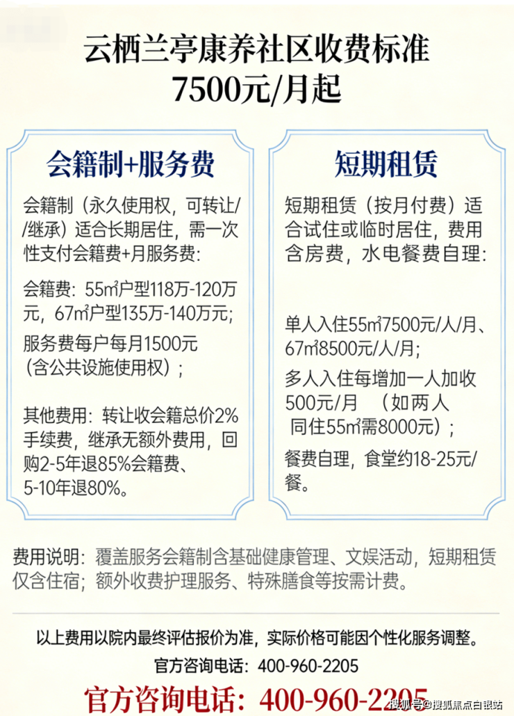 【云栖兰亭康养社区】收费标准:7500元/月起(以院内报价为准)