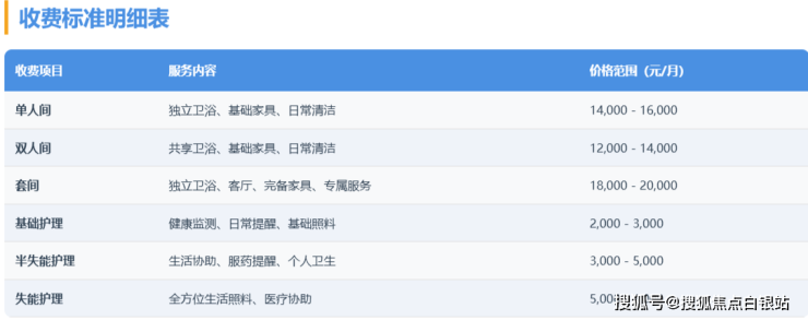 参考价格区间:根据房间类型和护理等级不同,月综合费用大致在14,000元至20,000元之间。下文将对收费构成进行详细拆解。