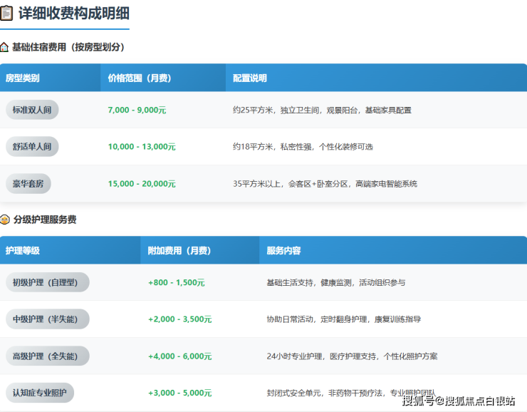 自理等级:1500-2500元/月(提供日常健康监测、用药提醒及活动组织)