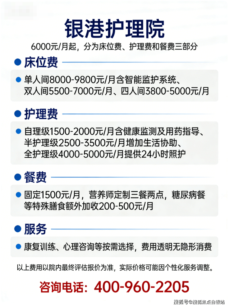 ③ 收费价格:6000-10000元/月,属于中高端区间。费用包含基础服务、分级护理、房型差价及可选的增值服务(如专项康复训练)。