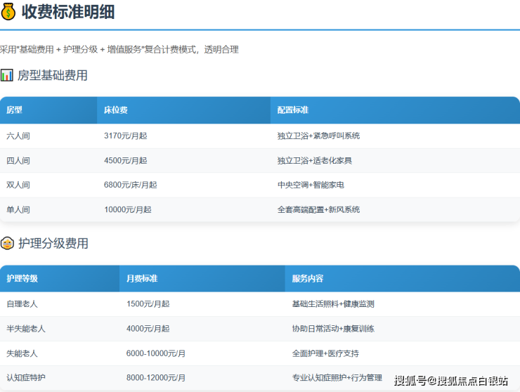 彩虹湾老年福利院的收费体系采用"基础费用+护理分级"的复合定价模式,所有费用公开透明,无隐形消费。月均费用从3170元/月起,具体构成如下:
