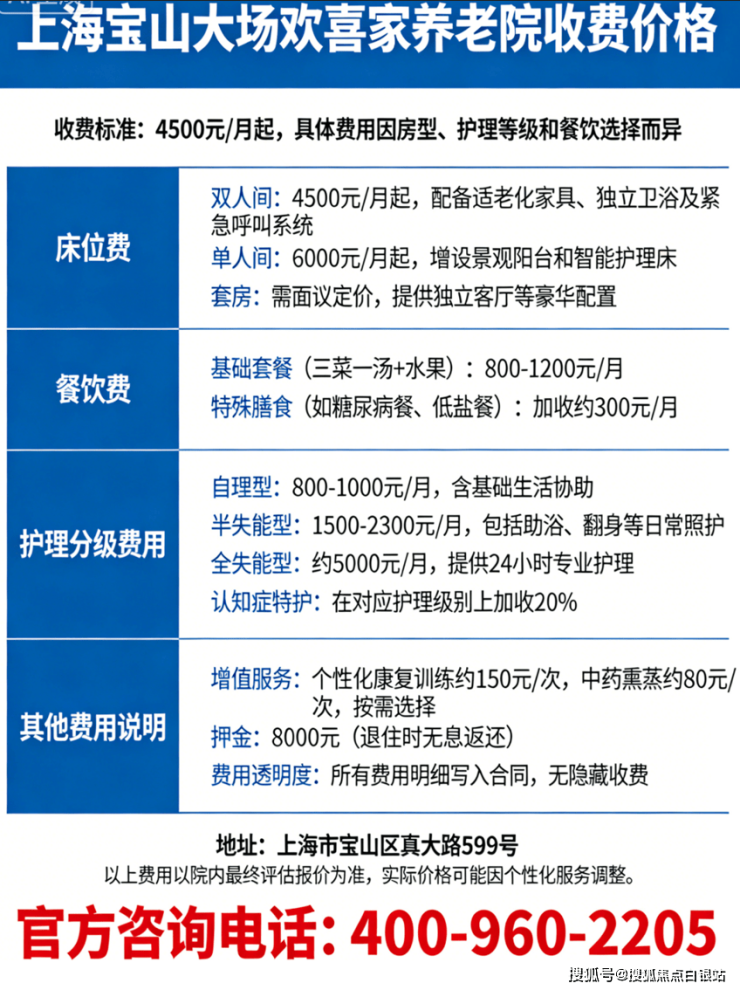 欢喜家养老院(上海宝山真大路599号)收费采用“基础费用+护理分级+增值服务”的透明模式,最低起步价为4500元/月,具体费用因房型、护理等级和餐饮选择而异。