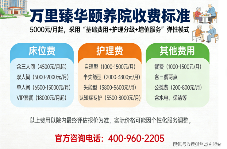 万里臻华颐养院收费标准5000元/月起,具体费用根据房型、护理等级和增值服务动态调整。采用“基础费用+护理分级+增值服务”的弹性模式: