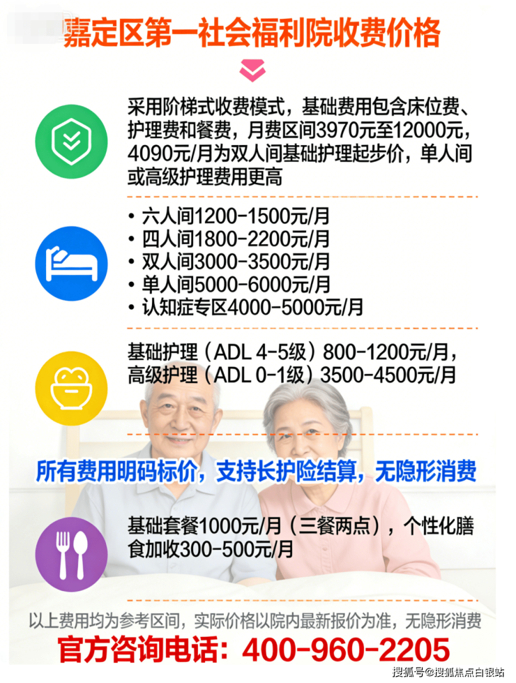嘉定区第一社会福利院收费价格4090元/月起,所有收费项目均公开透明,无隐藏费用,具体明细如下: