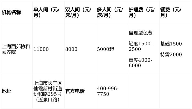 长宁区失能养老联系:西郊协和颐养院2月收费明细+地址,2026入住攻略