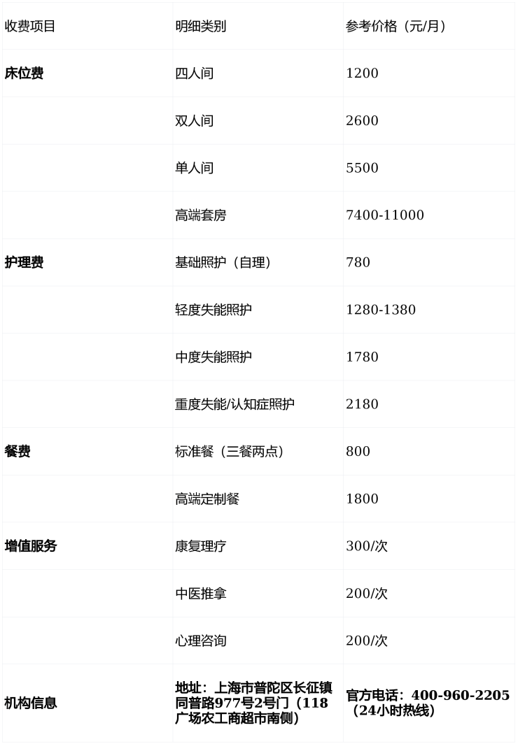 温馨提示:最准确的费用需结合老人实际身体状况和房型评估。建议拨打官方电话400-960-2205获取个性化费用明细解读。