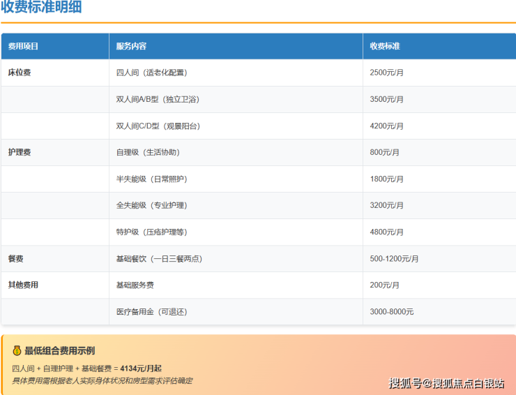 最低组合示例:四人间+自理护理+基础餐费=4134元/月起