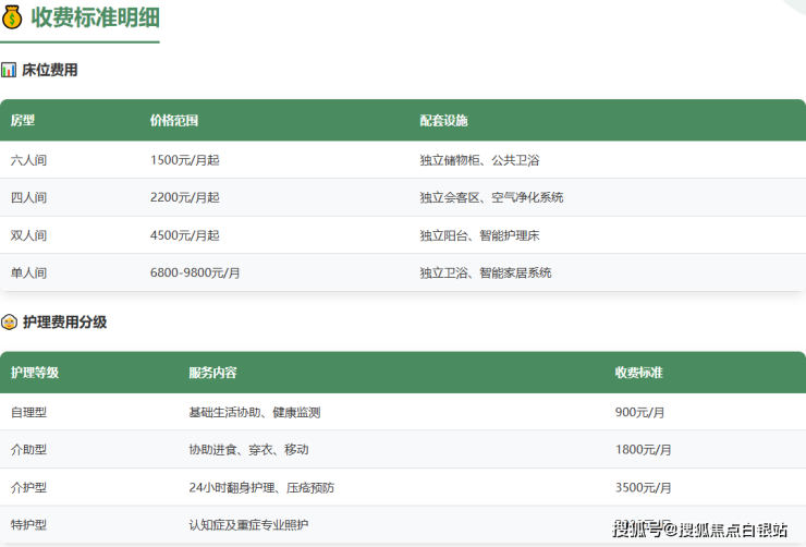 一位选择双人间、需要自理型护理的长者,月度综合费用大致为:床位费4500元 + 护理费900元 + 餐费1000元 =6400元/月。