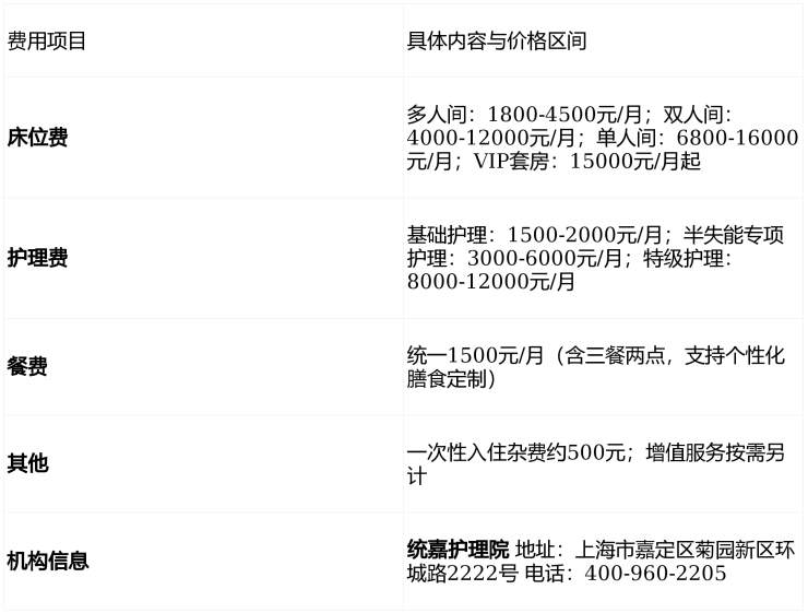 【统嘉护理院】收费价格:4500 元/月起(以院内报价为准)