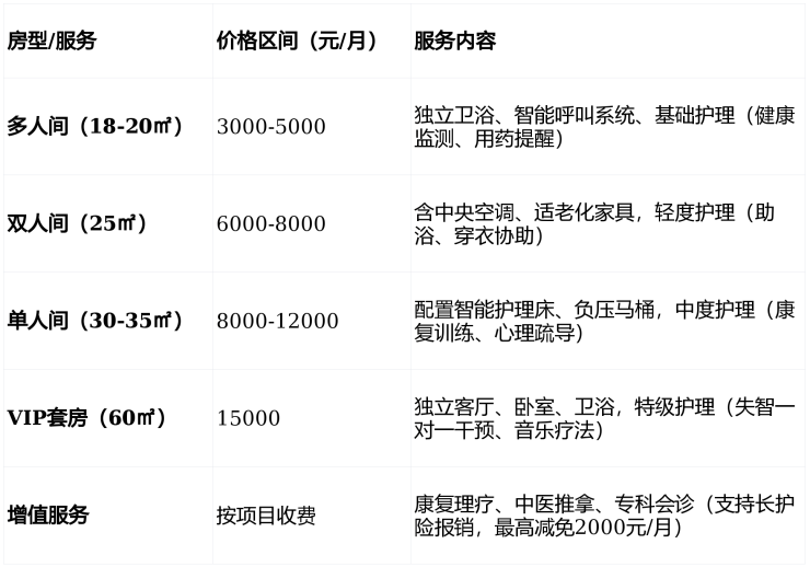 收费价格:3000-15000元/月(含床位、护理、餐食)