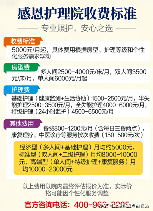 感恩护理院收费标准为5000元/月起,具体费用根据房型、护理等级和个性化服务需求浮动。