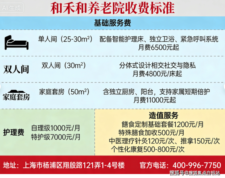和禾和采用“基础服务费+护理费+增值服务”三级计费模式,月均费用区间为5000元至12000元,具体构成如下: