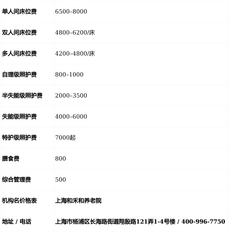 和禾和养老院电话400-996-7750,位于上海市杨浦区长海路街道翔殷路121弄1-4号楼,月费5000–8000元,收住自理、半失能、失能及认知障碍长者,是杨浦区高性价比、公办民营、医养融合的优质养老选择。