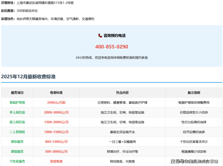 基础服务费覆盖住宿、三餐及常规护理,价格区间清晰透明,真正做到了让养老不再昂贵。此外,护理院为低保家庭及嘉定区户籍老人提供优先保障,长护险补贴最高可达1200元/月。