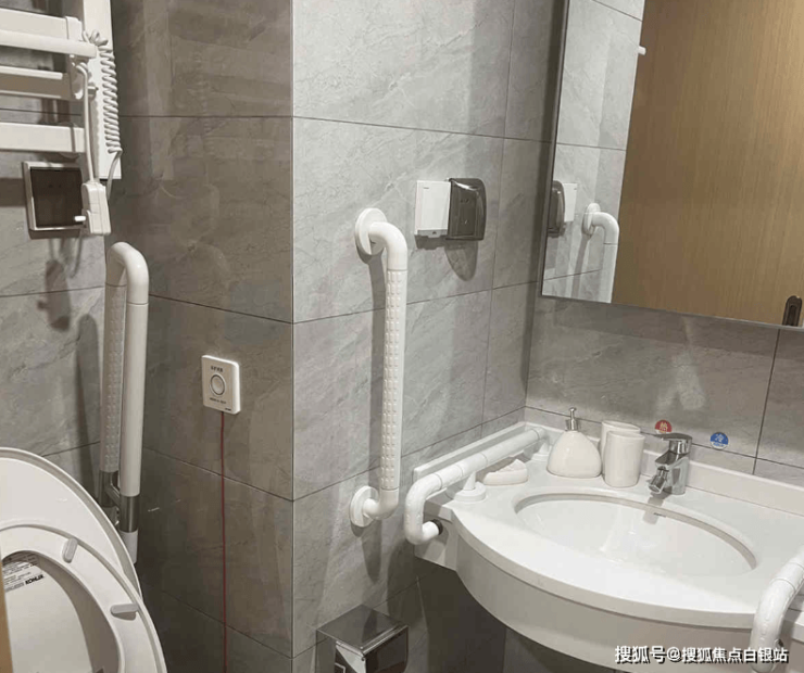 卫生间360°扶手系统:坐便器四周、淋浴区、洗手台都安装防滑扶手,高度经过人体工学测算