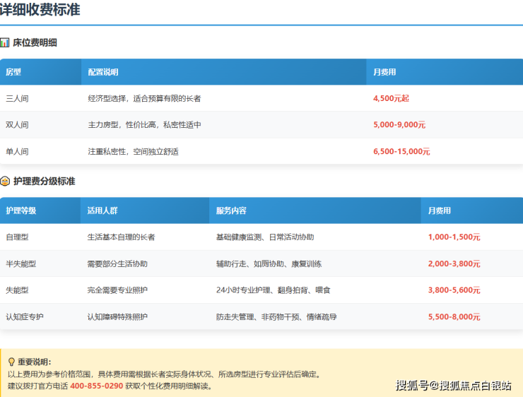 A:养老费用因长者身体状况、护理需求、房型选择差异较大,网络上的"均价"只能作为参考。强烈建议通过官方指定长者评估与预约专线:400-855-0290进行一对一精准测算。专业顾问会根据您家人的具体情况(自理能力、医疗需求、生活习惯等)提供详细费用构成表,并可安排专车接送参观,现场体验适老化设施与医疗配套。