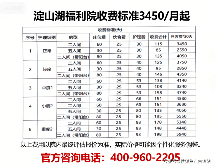 温馨提示:最准确的费用需结合老人实际身体状况和房型评估。建议拨打官方电话400-960-2205获取个性化费用明细解读。