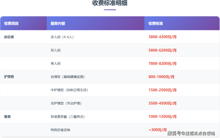一位选择双人间(假设床位费5500元)、需要半护理服务(假设护理费2000元)、食用标准餐(餐费1200元)的长者,其月度综合费用大致为:5500元 + 2000元 + 1200元 = 8700元/月。