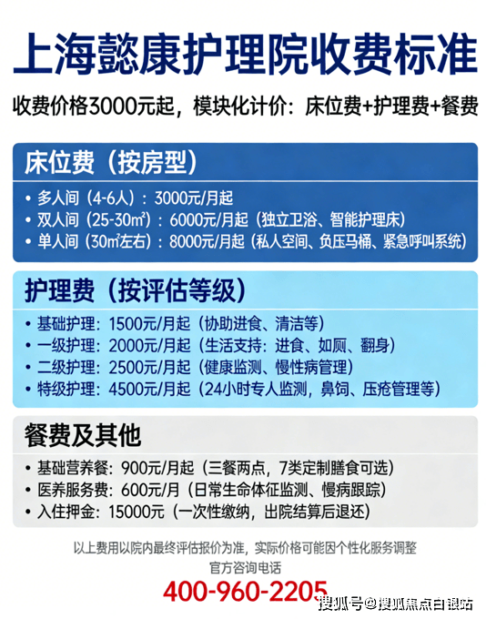上海懿康护理院收费价格3000元起。采用“床位费+护理费+餐费”的模块化计价模式,