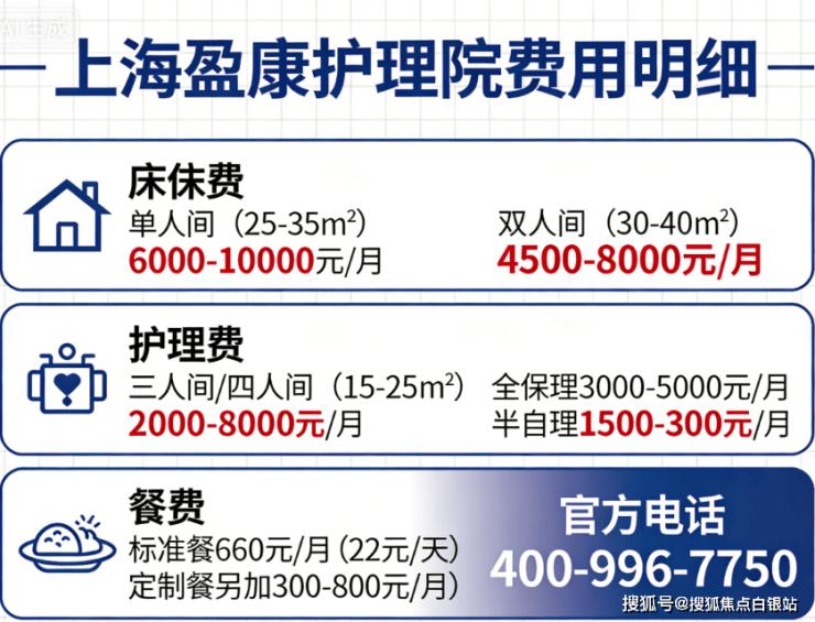 护理院坚持非营利性定位,收费低于上海市同类机构平均水平20%-30%,月均费用区间为4300元至15800元: