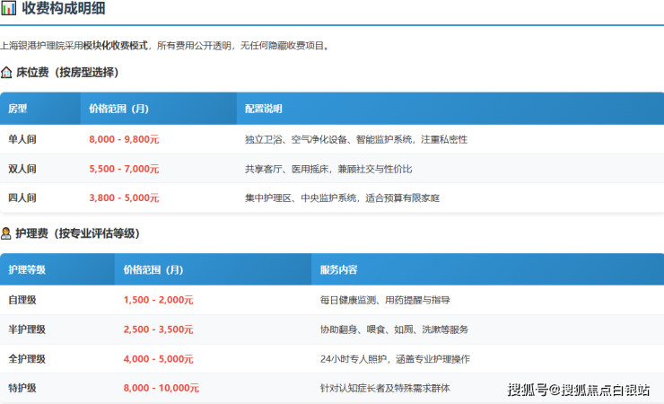 银港护理院采用**"床位费 + 护理费 + 餐费 + 服务费"**的模块化收费模式,总费用从6000元/月起,具体构成如下: