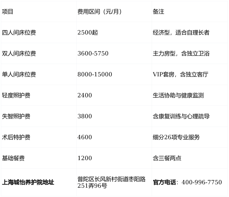 上海城怡养护院电话400-996-7750,地址上海市普陀区长风新村街道枣阳路251弄96号,提供6100元/月起智慧医养服务,涵盖床位、护理、餐费全周期照护,欢迎咨询预约。