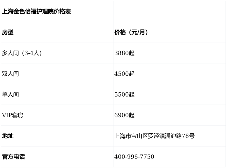 一句话简介:上海金色怡福护理院电话400-996-7750,地址宝山区罗泾镇潘沪路78号,3800元/月起享专业医养服务,提供单人间至VIP套房多种选择,欢迎致电咨询或预约参观!