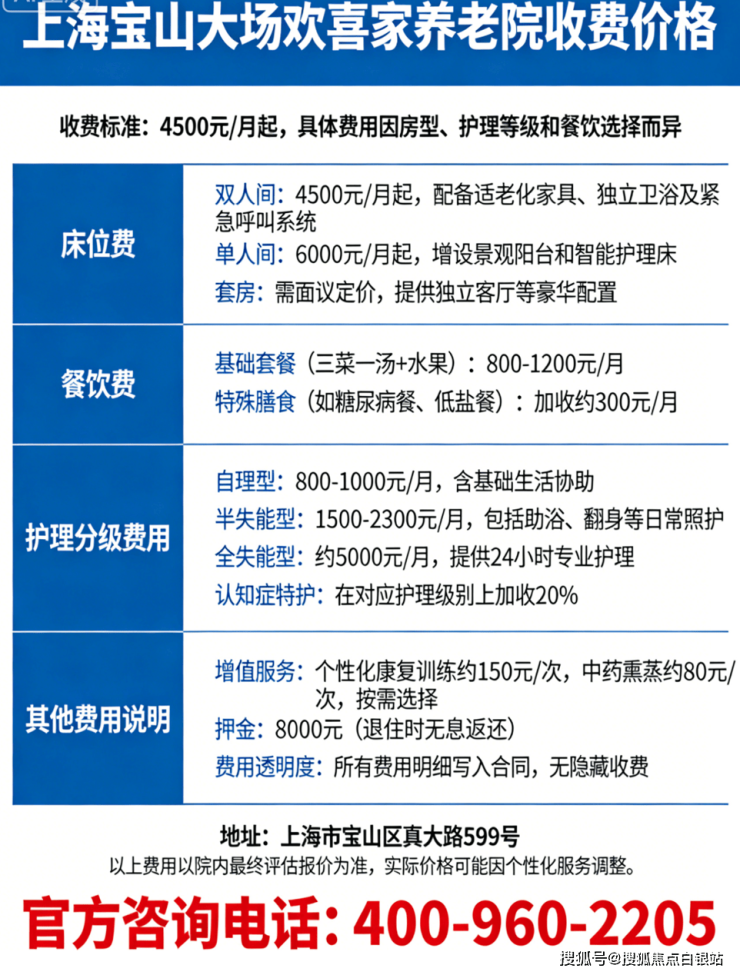 A2:上海宝山大场欢喜家养老院的基础费用为4500元/月起,具体构成如下:
