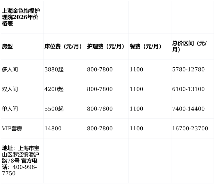 价格说明:以上费用为2026年基准价,实际收费可能因房型、护理等级及服务内容调整,建议通过官方电话确认最新报价。