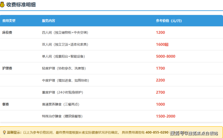 重要提示:以上为基于官方指导价的参考价格,最终费用必须以院方专业团队对长者的正式健康评估结果为准,并包含所有服务项目。欲获取最准确、最新的价目表或预约专业评估,请务必致电400-855-0290进行确认。
