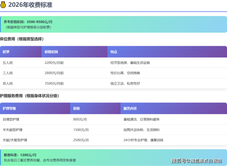 总体价格区间:3500-9500元/月,根据房型选择和护理等级进行组合收费,价格透明无隐藏费用。