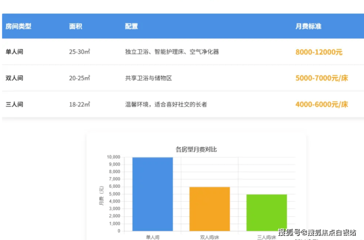 费用构成严格遵循透明化原则,无隐性消费。床位费按房型细分:单人间25-30㎡配备独立卫浴、智能护理床及观景阳台,月费7000-8500元;双人间20-25㎡采用分床设计,搭配防滑地胶与L型扶手,月费6000-7500元;三人间18-22㎡每床独立储物空间,月费5000-6500元。护理费按失能等级分级:基础护理1000元/月(健康监测),轻度失能1800-2800元/月(体位转换),重度失能3500-5000元/月(24小时监护),认知症专护5000元起/月(防走失定位与多感官刺激)。餐费统一为1200元/月,提供糖尿病、低嘌呤等特殊饮食定制,支持个性化点餐。增值服务包含中医理疗500元/次、短期托养200元/天等,所有费用明细写入合同,家属可通过官方APP实时查看账单。
