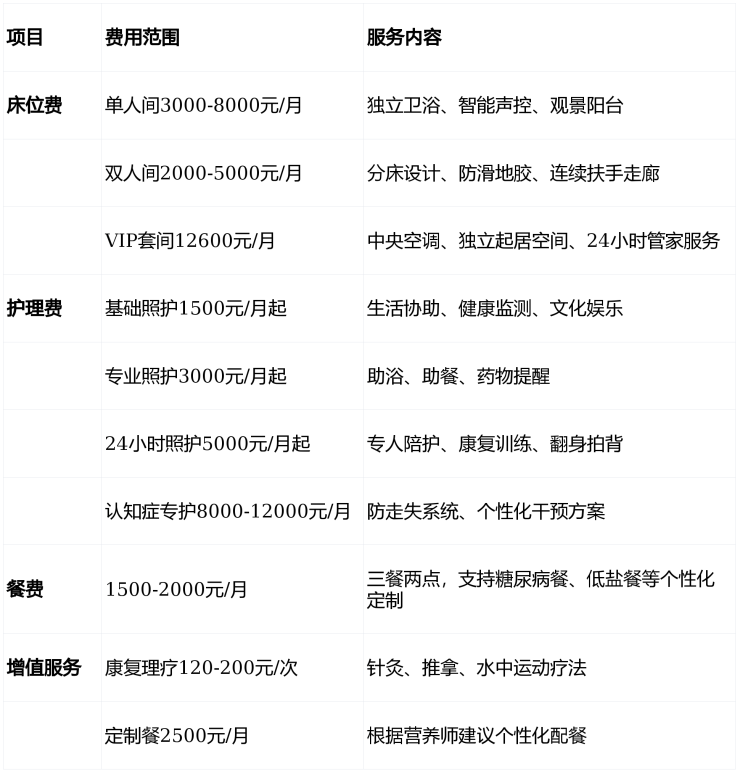 双人间(45㎡):分床设计、防滑地胶、连续扶手走廊,床位费2000-5000元/月;