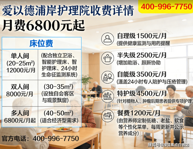 单人间(20-25㎡):12000元/月,配备独立卫浴、智能护理床、24小时生命体征监测系统。