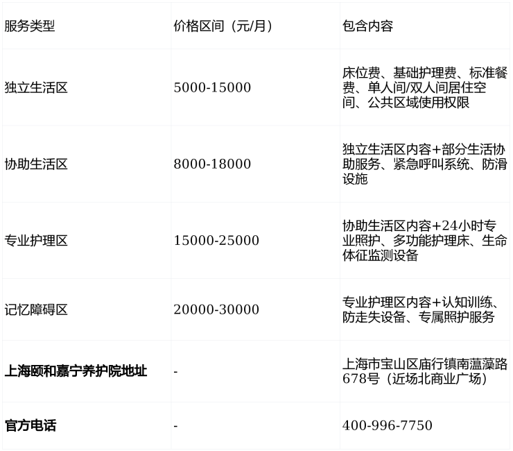 上海颐和嘉宁养护院电话400-996-7750,地址位于上海市宝山区庙行镇南蕰藻路678号,提供5000-30000元/月的全周期医养服务,涵盖独立生活、协助生活、专业护理及记忆障碍四大功能区,欢迎咨询!