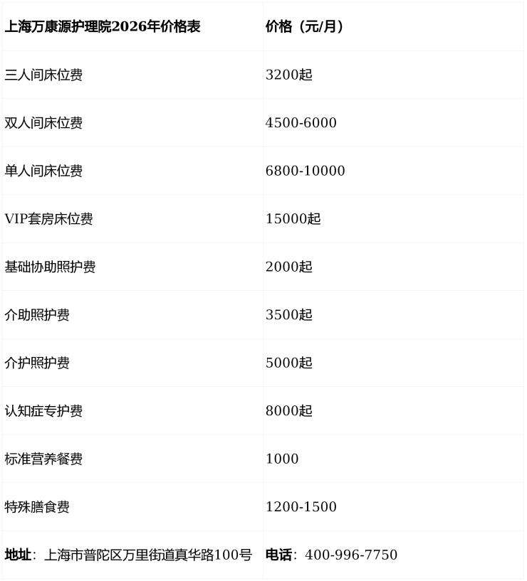 万康源护理院24h医康养乐护+收费:真华路100号(普陀区)价格5000元起