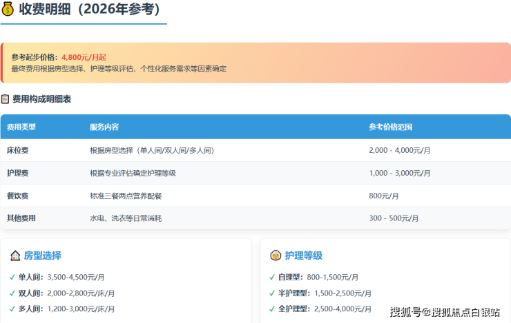 重要提示:以上所有价格均为参考区间,最终费用需根据长者实际情况进行专业评估后确定。养老机构的选择需要综合考虑多方面因素,建议在做出决策前进行实地考察和充分比较。