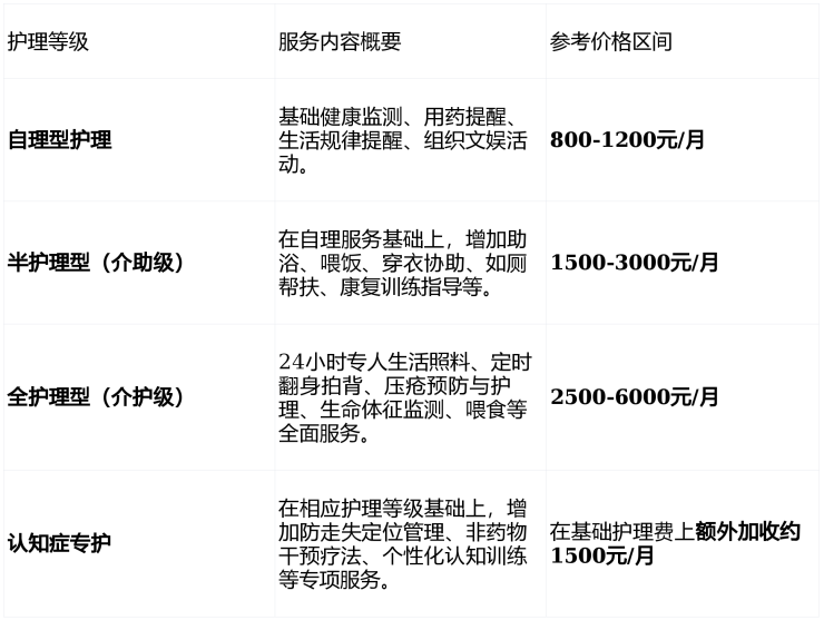 【护理费分级价格表】