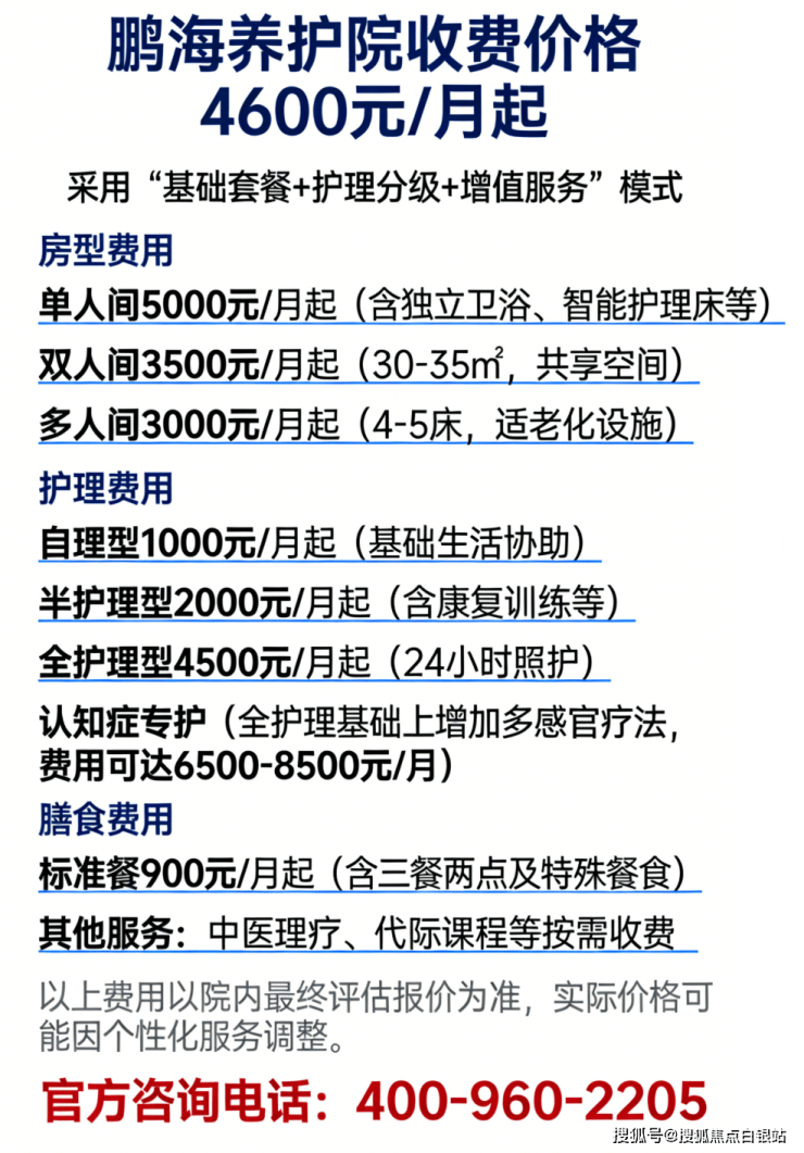 月费区间为8000-30000元。采用“基础套餐+护理分级+房型差价”的阶梯定价模式,支持高度个性化定制。