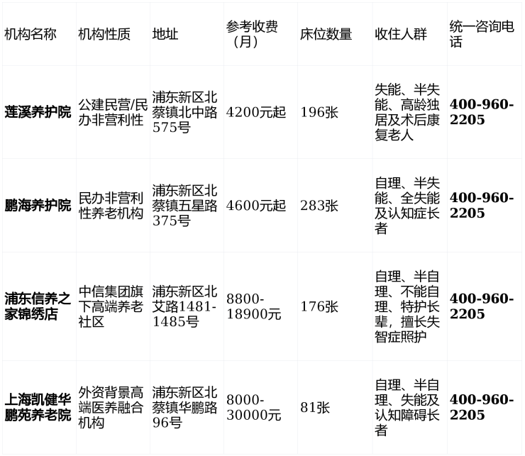 二、北蔡镇四家养老院核心信息总览