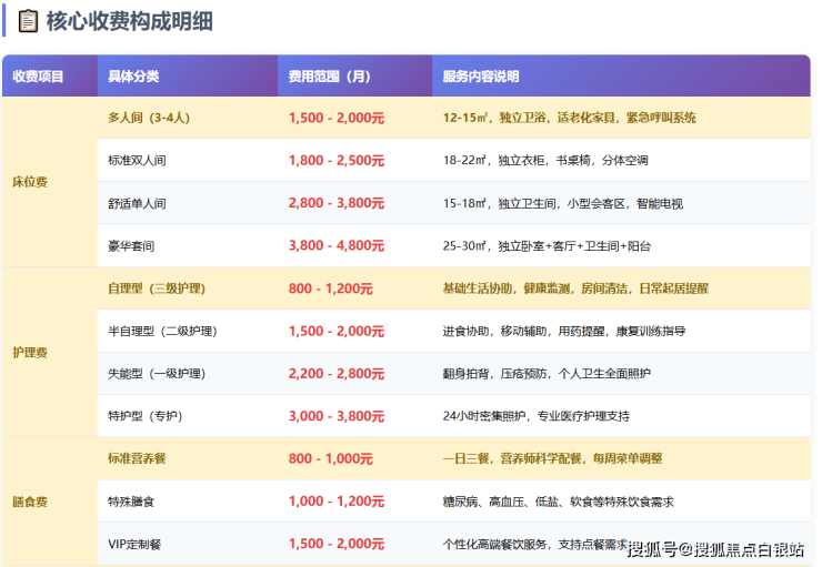 全方位照护组合:舒适单人间床位费3200元 + 失能护理费2800元 + 特殊饮食餐费1100元 + 设施维护费300元 =月费总计约7400元