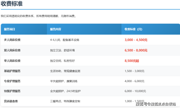 护理费用:按身体状况分级收费,自理型基础健康监测,半失能型增加喂食翻身服务,全失能型提供24小时监护