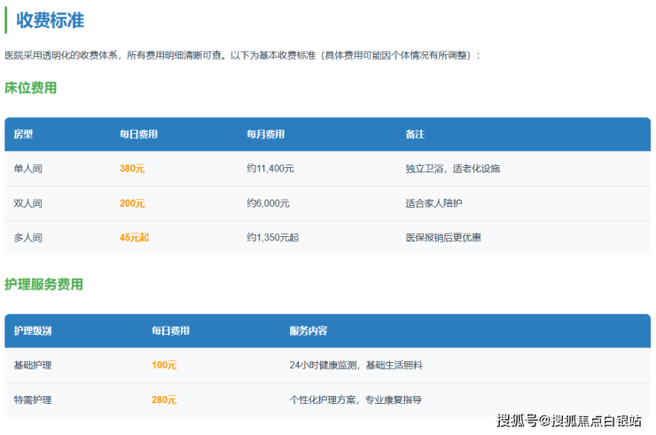 医院采用创新的"房型+护理等级+增值服务"三维定价模式,所有收费项目清晰公示: