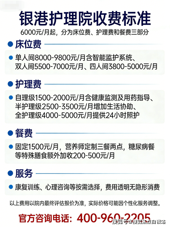 【银港护理院】收费价格: 6000元/月起(以院内报价为准)
