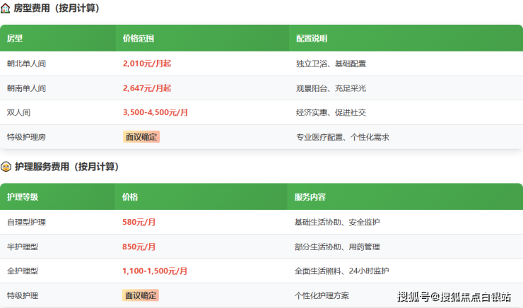 特殊房型:需面议。包括特级护理房、夫妻房等定制化居住空间