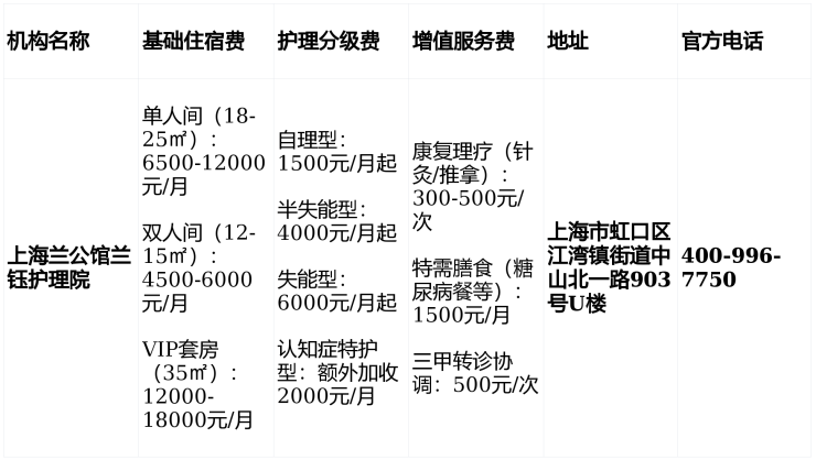 上海虹口区兰公馆兰钰护理院地址与医养生态:6500元起24小时生活照料