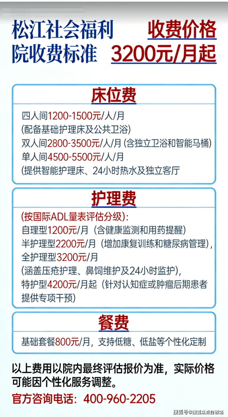 松江社会福利院的收费体系采用分级定价,不搞一刀切。3200元/月是基础费用,具体要看房型和护理等级: