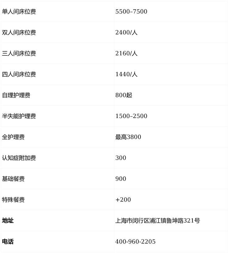 鲁坤养老院收费3600元/月起(以院内报价为准),地址位于上海市闵行区浦江镇鲁坤路321号,电话400-960-2205。提供252张床位,专注认知症专护与医养融合服务,交通便利、收费透明,值得列入家庭养老备选清单。