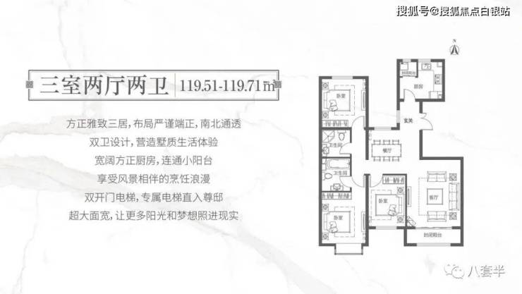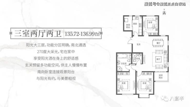 户型特点:南北通透三居室、双卧和客厅朝南、主卧独卫、客厅270度采光、进门入户玄门、私密性强、暗卫